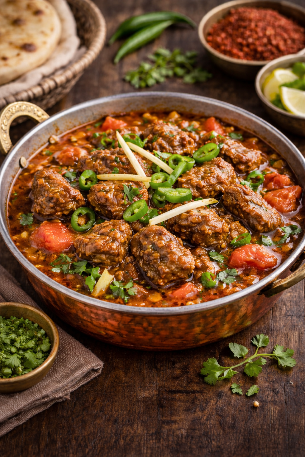 Tender beef cooked with fresh tomatoes, green chilies, ginger, and traditional spices in a classic karahi style. Rich, flavorful, and perfect for family meals and events.